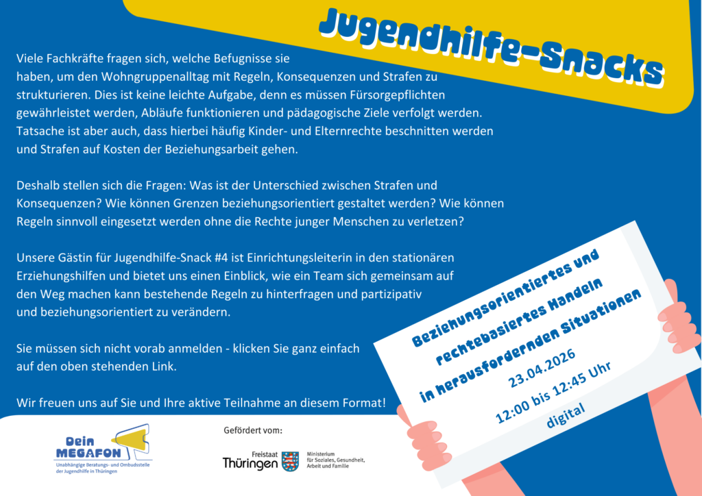 Am 04. Dezember 2025 lädt die Ombudsstelle Dein Megafon Sie herzlich zum nächsten digitalen Jugendhilfe-Snack ein!